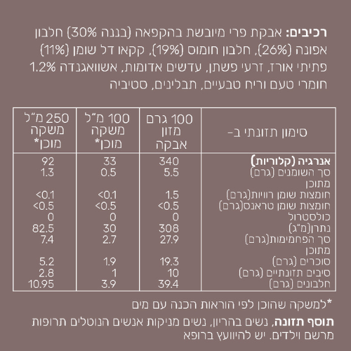משקה קקאו עשיר התורם להרגעת הגוף. עשיר ב-3 מקורות חלבון שונים - אפונה, חומוס וזרעי פשתן וכן קקאו ושורש אשווגנדה - ידוע כמפחית מתח וחרדה.