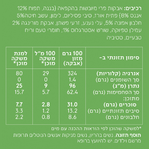 מכיל נוגדי חמצון, אשלגן, סיבים תזונתיים, ויטמין C, סידן מגנזיום. מחזק את מערכת החיסון, משפר את העיכול ומשפר את תפקוד החיידקים הטובים במעי.